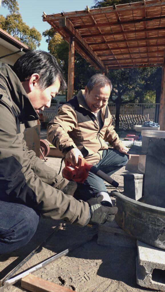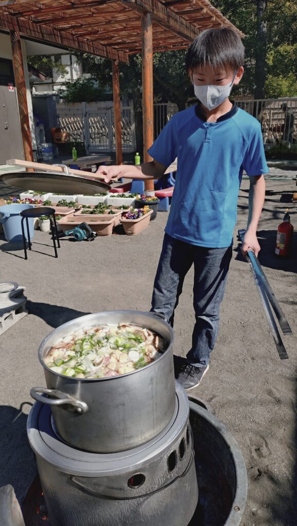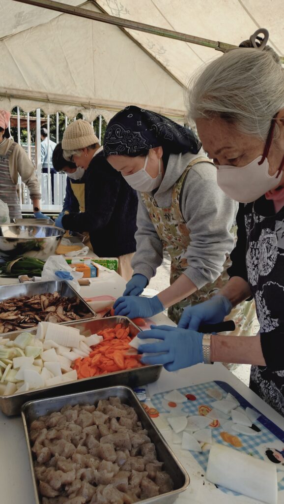 朝8時からテント設営、かまどの設置と火起こし、おにぎりと豚汁の下ごしらえ。災害時を想定して、大きな羽釜2つと寸胴鍋3つで約70人分の炊き出しを行います。